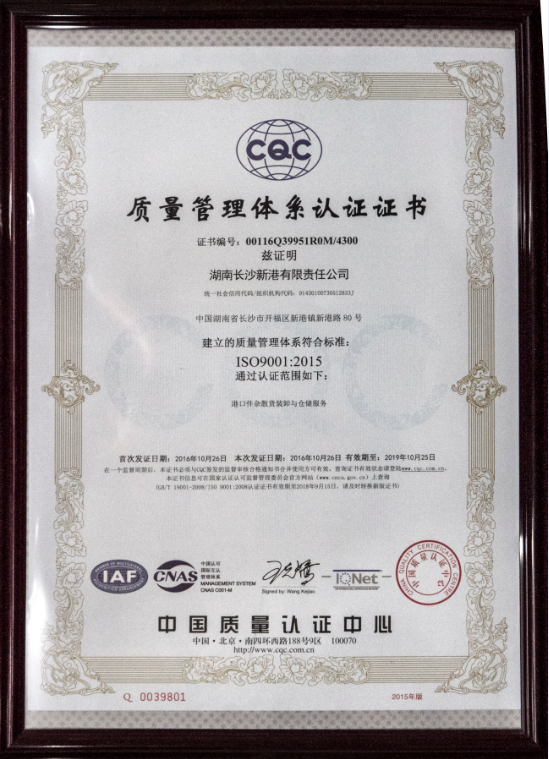 通過兩個月的試運行,5位評審專家于10月9日對公司ISO9001:2015質(zhì)量管理體系進行了認證評審。經(jīng)過嚴格審核,評審專家認為公司編制的《質(zhì)量安全管理流程手冊》規(guī)范科學(xué),切合企業(yè)實際,在試運行中取得了較好的效果,一致通過我公司的認證資格。中國檢驗認證集團湖南有限公司于10月26日正式頒發(fā)新港公司ISO9001:2015質(zhì)量管理體系證書。