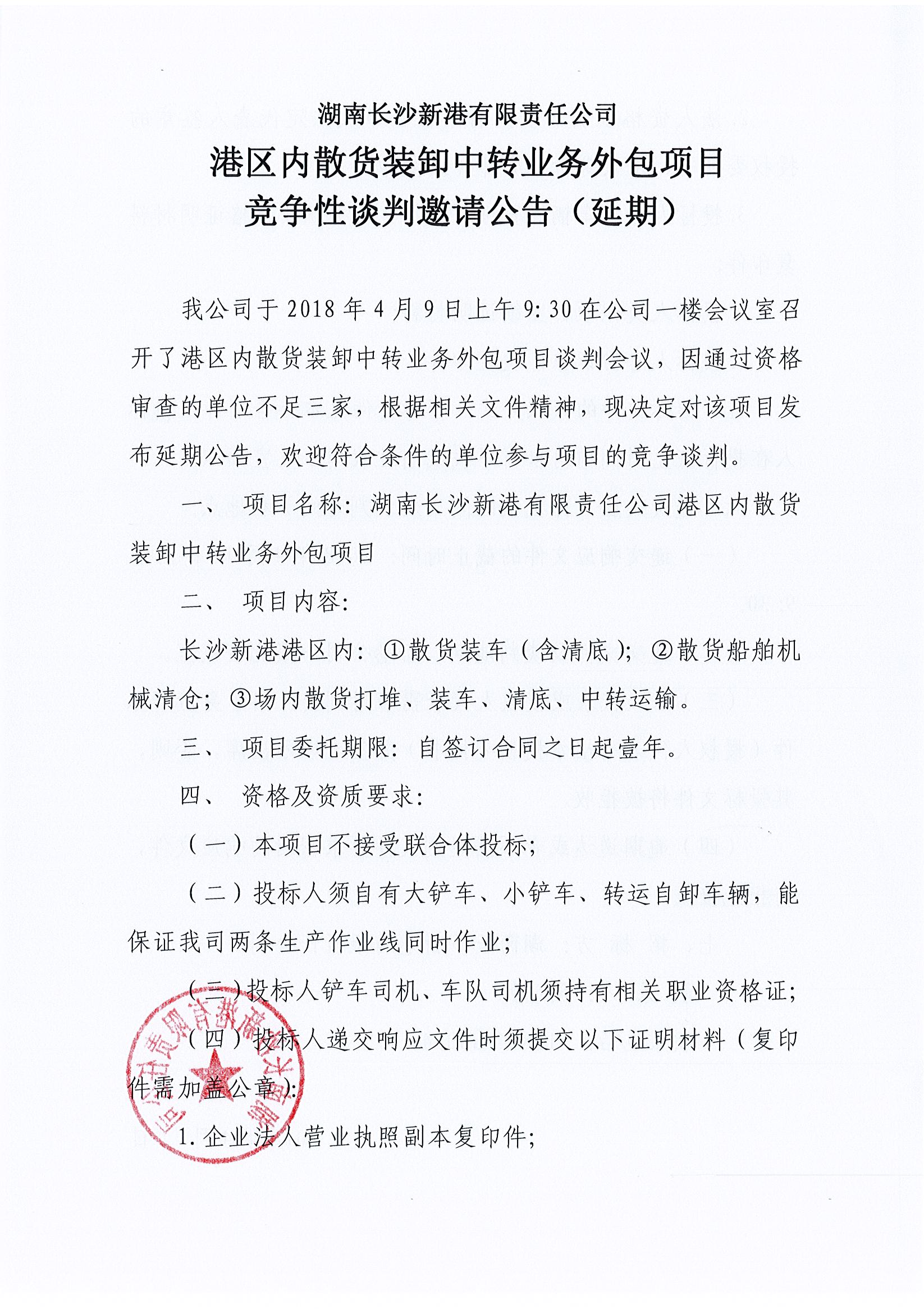 港區(qū)內(nèi)散貨裝卸中轉(zhuǎn)業(yè)務(wù)外包項(xiàng)目競(jìng)爭(zhēng)性談判邀請(qǐng)公告(延期)