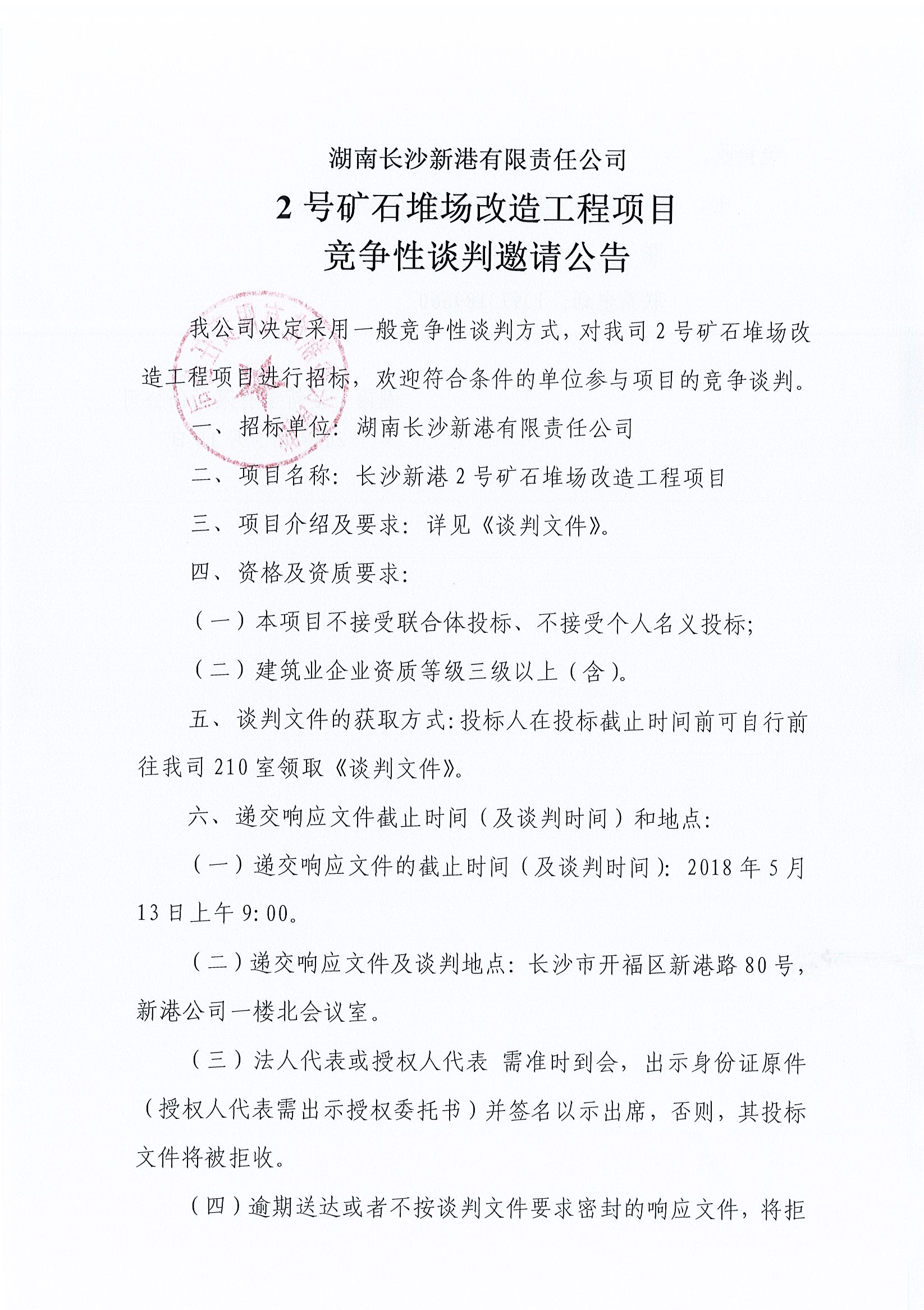 湖南長(zhǎng)沙新港有限責(zé)任公司 2號(hào)礦石堆場(chǎng)改造工程項(xiàng)目競(jìng)爭(zhēng)性談判邀請(qǐng)公告