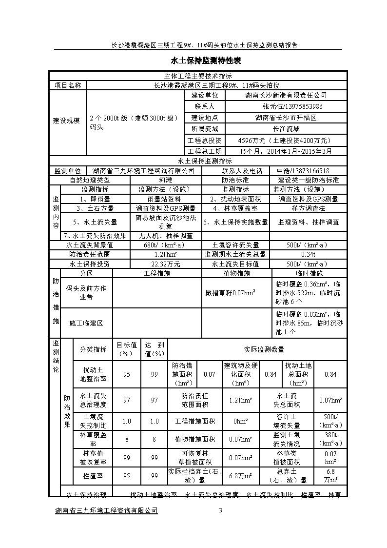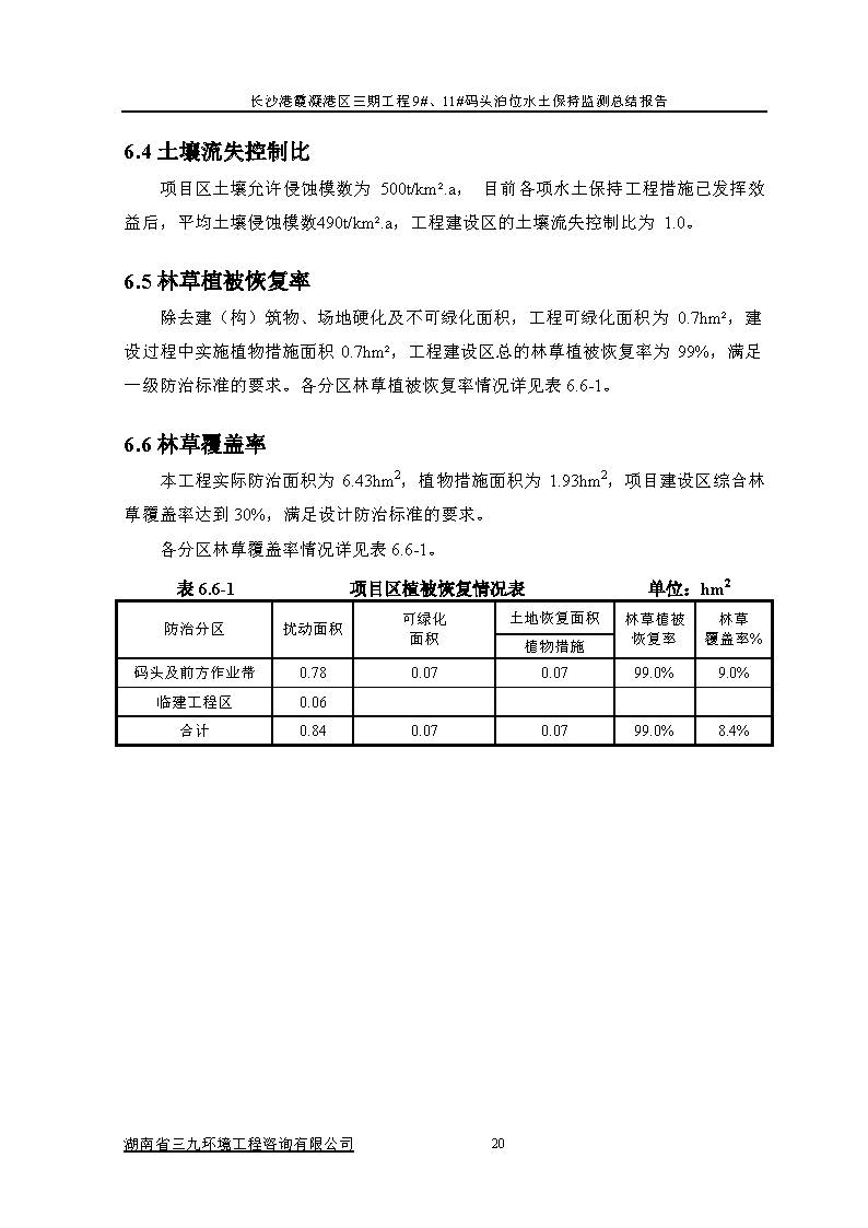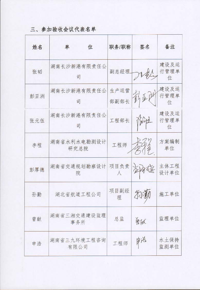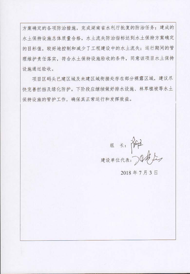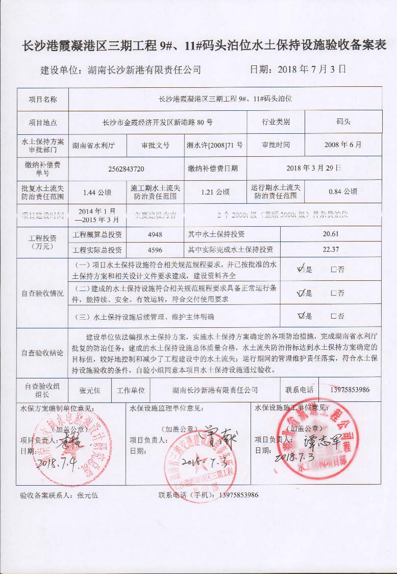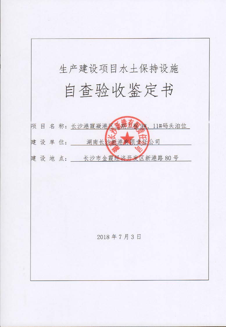 根據(jù)水利部關(guān)于加強事中事后監(jiān)管規(guī)范生產(chǎn)建設(shè)項目水土保持設(shè)施自主驗收的通知(水保(2017) 365號)、《湖南省水利廳關(guān)于下放部分生產(chǎn)建設(shè)項目水土保持方案審批權(quán)限的通知》(湘水辦[2017]116號)和《長沙市水務(wù)局關(guān)于簡化生產(chǎn)建設(shè)項目水土保持方案及水土保持設(shè)施驗收有關(guān)事項的通知》(長水發(fā)〔2017〕27號)規(guī)定,2018年7月3日,湖南長沙新港有限責任公司主持召開了長沙港霞凝港區(qū)三期工程9#、11#碼頭泊位水土保持設(shè)施驗收會議,會議成立了驗收組。 通過深入工程現(xiàn)場核查,并查閱相關(guān)檔案資料,驗收小組認為本工程積極落實了各施工區(qū)域的水土流失防治工作,水土保持設(shè)施質(zhì)量總體合格,水土流失防治指標達到了水土保持方案確定的目標值,符合水土保持設(shè)施竣工驗收的條件。驗收組一致同意長沙港霞凝港區(qū)三期工程9#、11#碼頭泊位水土保持設(shè)施通過驗收。經(jīng)驗收組與會議審議,形成了《長沙港霞凝港區(qū)三期工程9#、11#碼頭泊位水土保持設(shè)施自查驗收鑒定書》。