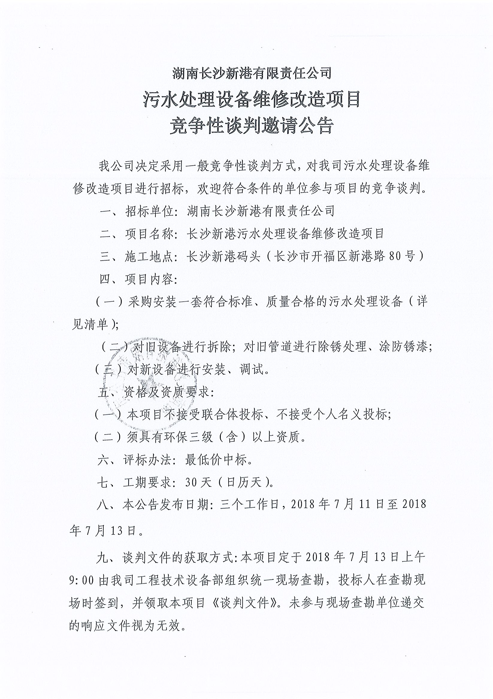 湖南長(zhǎng)沙新港有限責(zé)任公司 污水處理設(shè)備維修項(xiàng)目競(jìng)爭(zhēng)性談判邀請(qǐng)公告