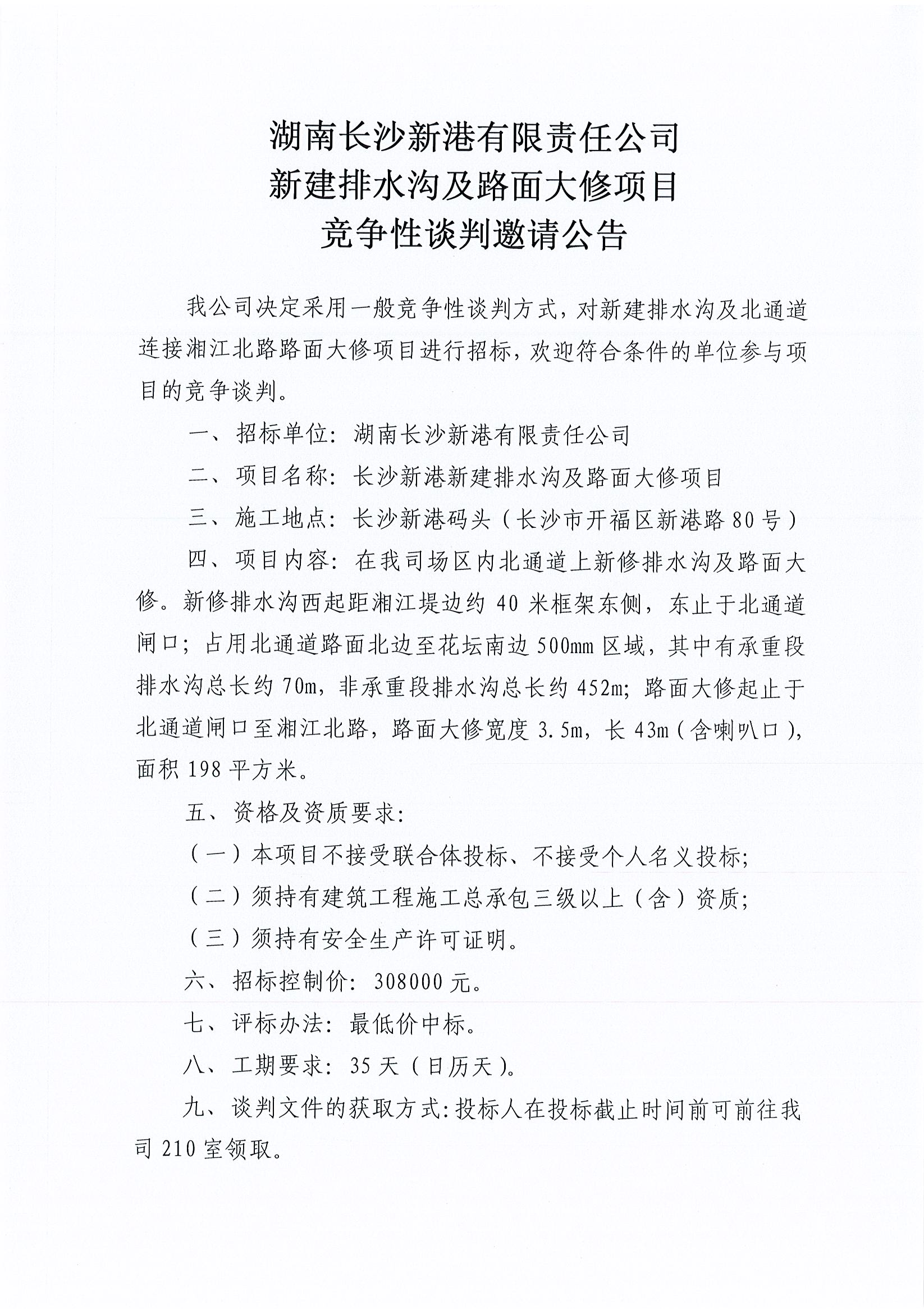 湖南長(zhǎng)沙新港有限責(zé)任公司 新建排水溝及路面大修項(xiàng)目競(jìng)爭(zhēng)性談判邀請(qǐng)公告