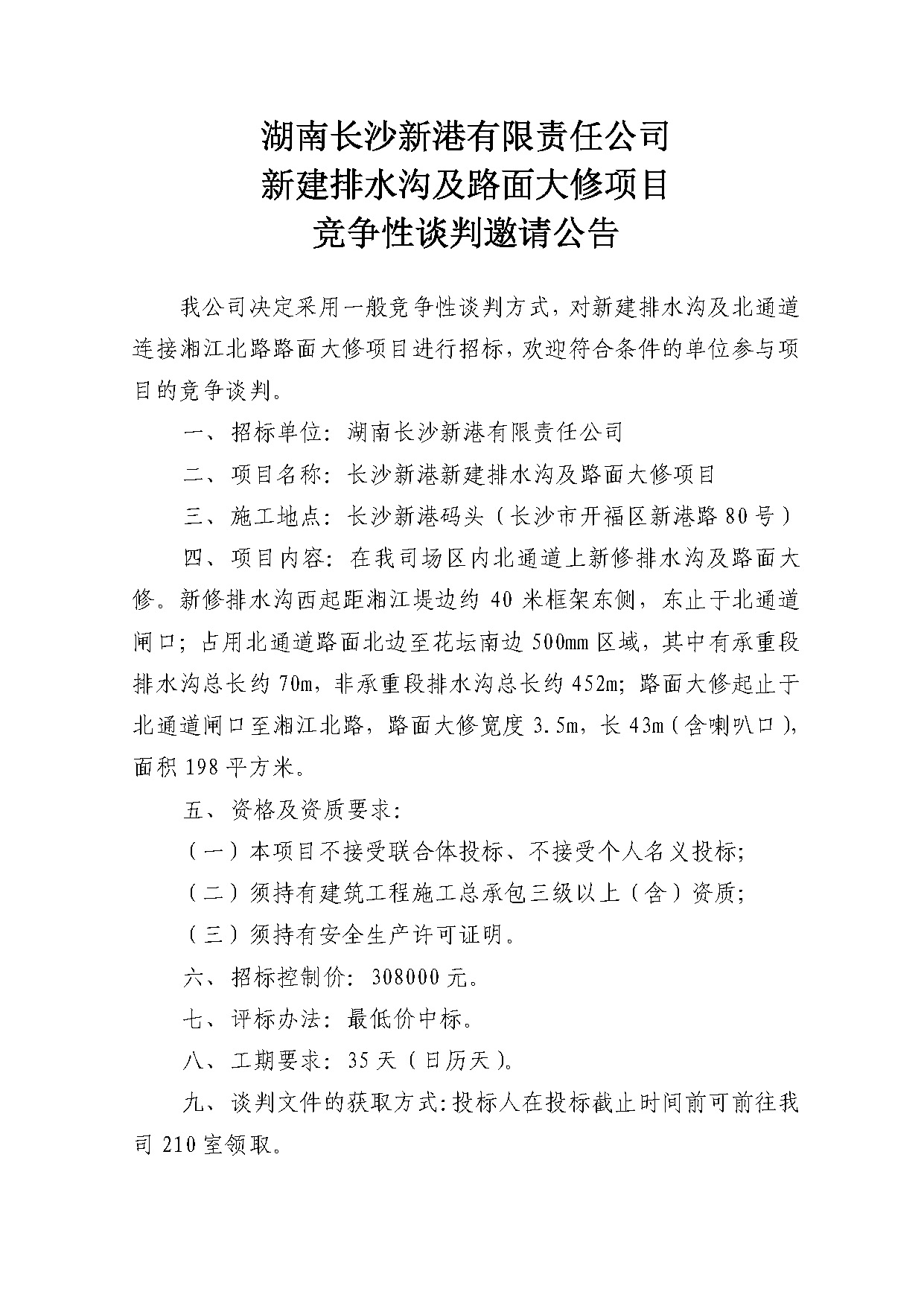 湖南長沙新港有限責(zé)任公司新建排水溝及路面大修項(xiàng)目邀請公告(延期)