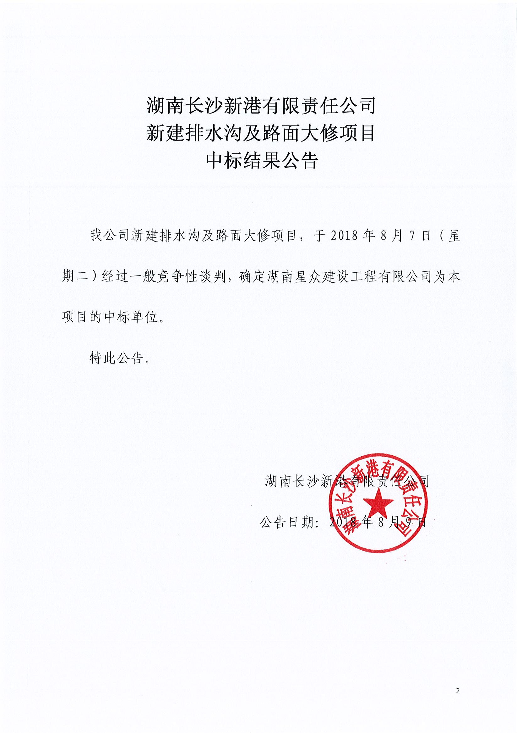 湖南長沙新港有限責(zé)任公司 新建排水溝及路面大修項(xiàng)目中標(biāo)結(jié)果公告