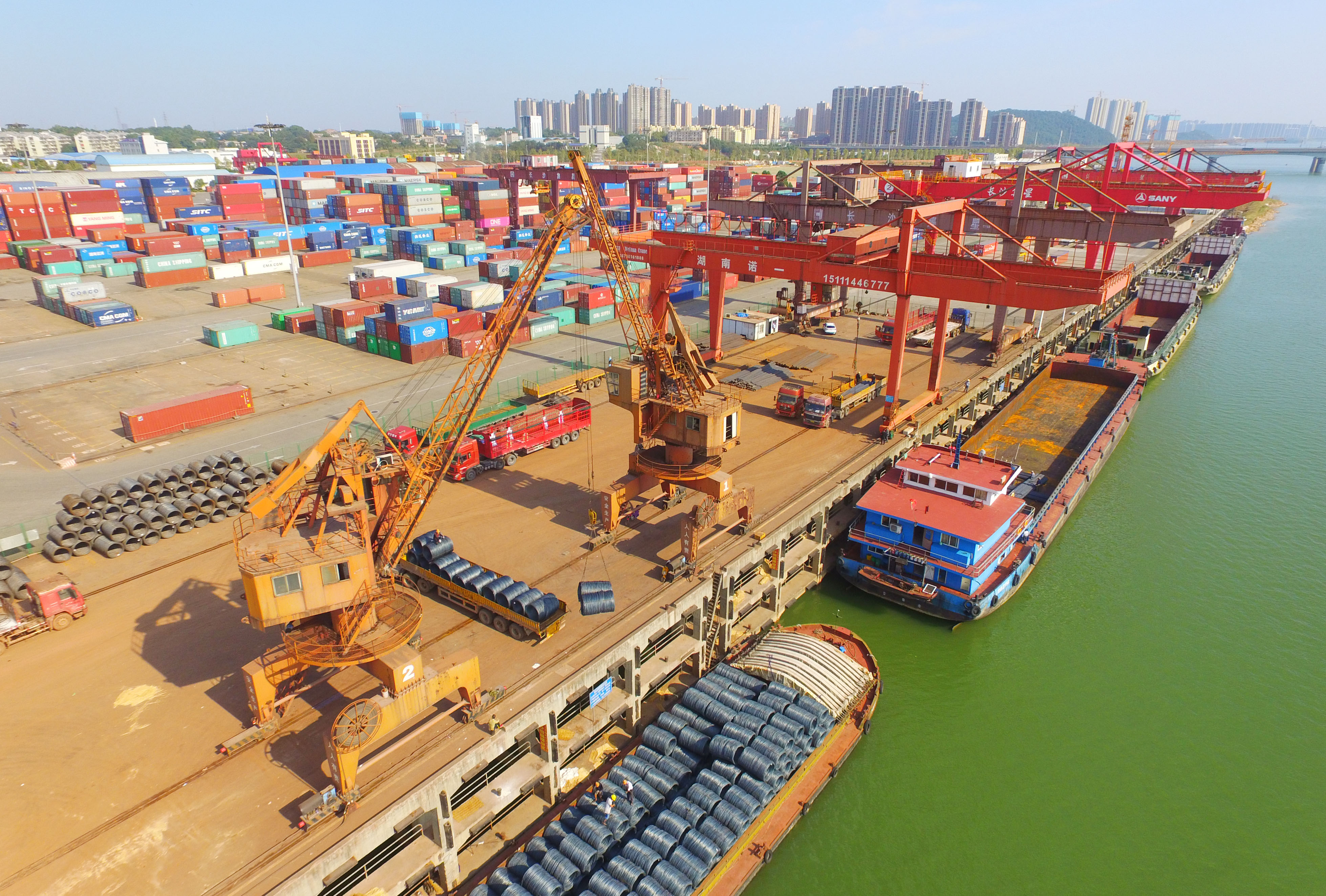 在長(zhǎng)沙新港,裝船機(jī)上下?lián)]舞臂膀,大型集裝箱鱗次櫛比,岸上吊車來(lái)回穿梭,一片繁忙景象。