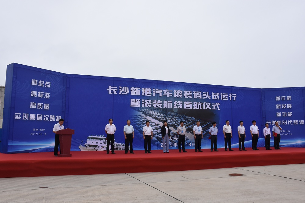 6月18日,隨著一聲汽笛鳴響,滾裝船“港達6號”輪駛離交通集團長沙新港汽車滾裝碼頭,船上裝載了廣汽三菱、廣汽菲克、北汽、吉利、馬自達等品牌的汽車近200臺,將于20小時后抵達武漢,輻射至川渝和華東地區(qū)。這是經(jīng)過一年半的緊張施工,克服諸多困難,在集團堅強領(lǐng)導(dǎo)下,長沙新港汽車滾裝碼頭發(fā)送的首條航班,標志著湖南省首個專業(yè)汽車滾裝碼頭正式投入試運行,徹底結(jié)束湘江商品汽車不能滾裝運輸?shù)臍v史。省人民政府辦公廳巡視員羅建軍,省水運管理局黨委書記、局長李建斌,市人民政府副市長邱繼興及行業(yè)相關(guān)部門領(lǐng)導(dǎo),各大港口、物流商和汽車主機廠嘉賓出席本次首航儀式。