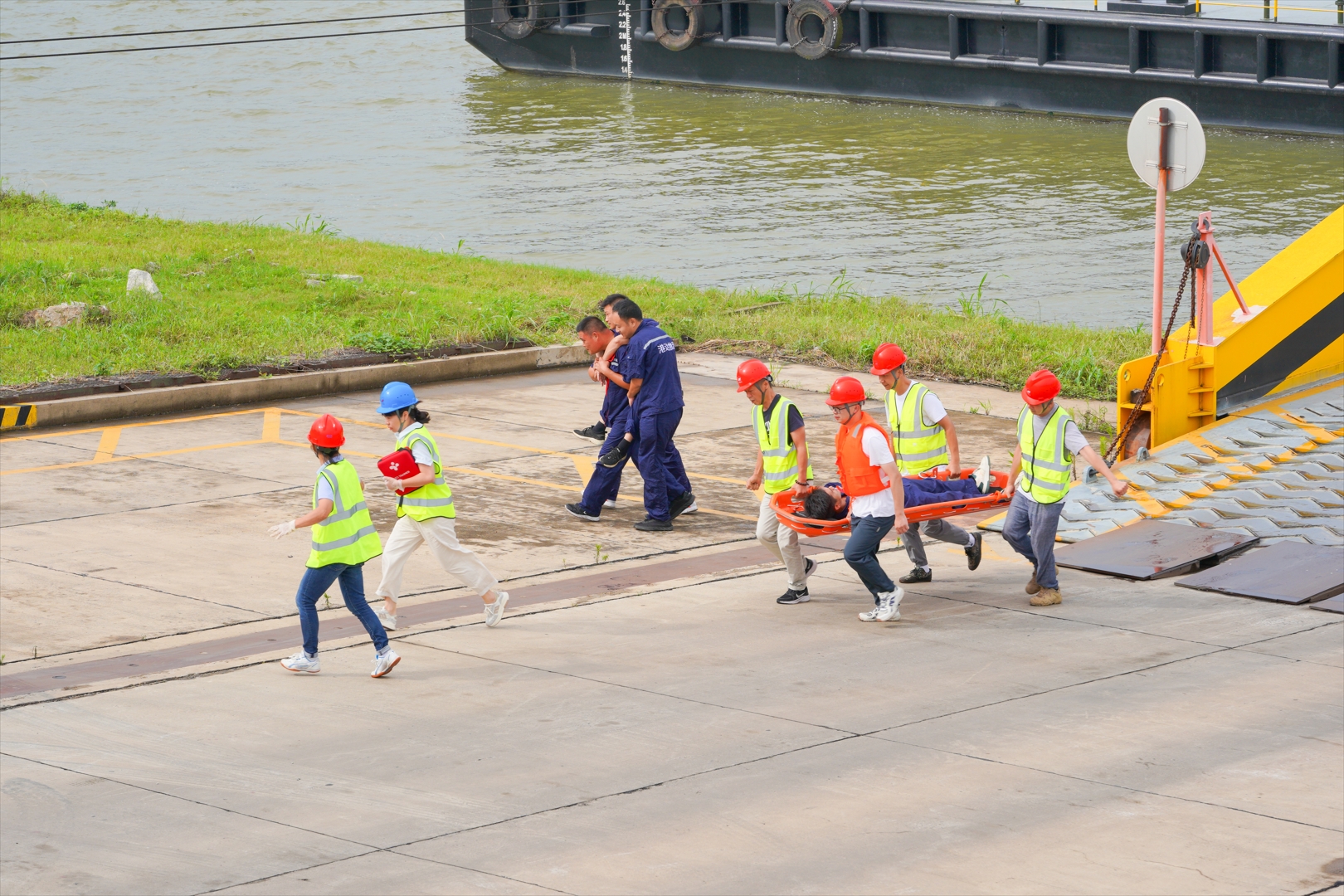 第二個(gè)演練項(xiàng)目,是模擬躉船短駁汽車撞擊護(hù)欄致使人員被困、車輛撞擊導(dǎo)致滾裝船發(fā)生火情。事故發(fā)生后,立即啟動應(yīng)急預(yù)案并逐級上報(bào),現(xiàn)場工作人員撥打119、120及應(yīng)急辦電話,請求社會力量參與救援。疏散警戒組立即封鎖現(xiàn)場并疏散人員,醫(yī)療救護(hù)組迅速救出傷員,轉(zhuǎn)移至安全區(qū)域,現(xiàn)場實(shí)施心肺復(fù)蘇。消防隊(duì)入場后立即架設(shè)水槍壓制火勢,啟動無人機(jī)投放水彈進(jìn)行滅火。同時(shí),水上救援中心的專業(yè)救援船到達(dá)后打開水槍,對準(zhǔn)滾裝船舶起火區(qū)域進(jìn)行噴水滅火,120救護(hù)車趕到現(xiàn)場將傷員送往醫(yī)院救治。 本次演練實(shí)現(xiàn)了新能源汽車起火、人員營救等多重風(fēng)險(xiǎn)同步處置,50余名救援人員、15臺專業(yè)裝備協(xié)同作戰(zhàn),20分鐘內(nèi)完成了從三級響應(yīng)到一級響應(yīng)的全鏈條處置。各演練小組快速響應(yīng)、協(xié)同配合,應(yīng)急處置準(zhǔn)確及時(shí),演練取得預(yù)期效果。