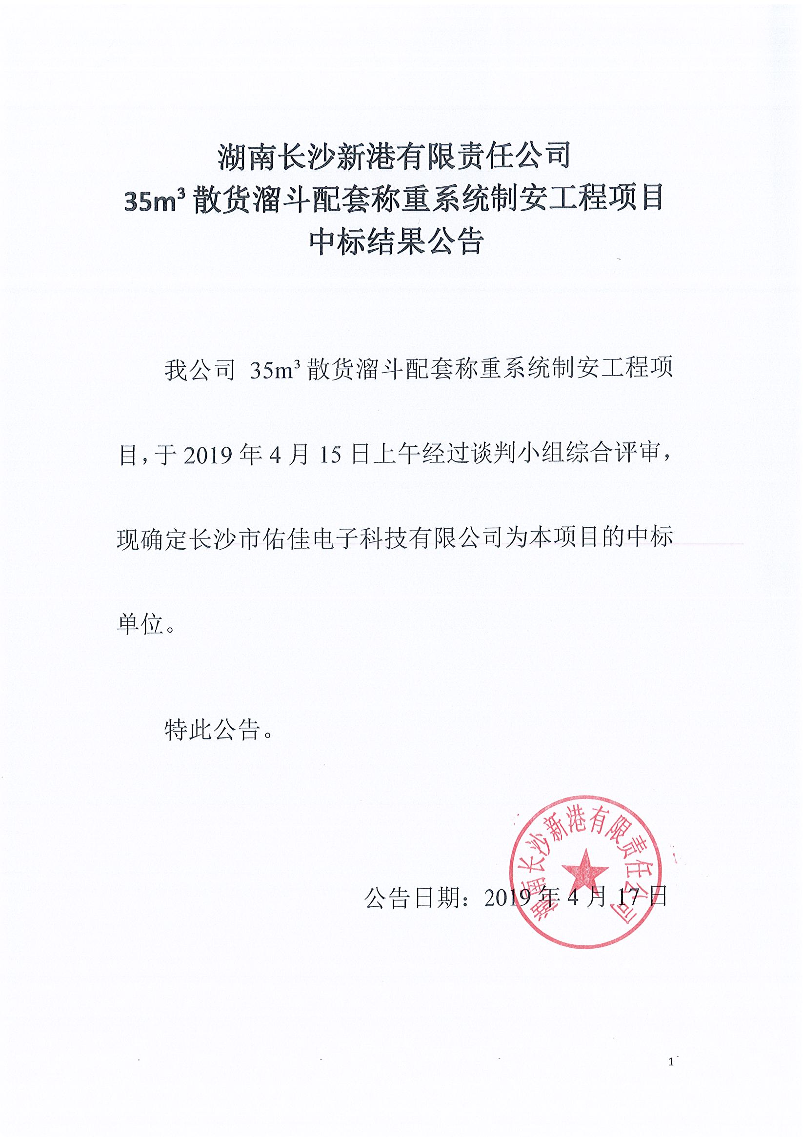 湖南長沙新港有限責(zé)任公司35m³散貨溜斗配套稱重系統(tǒng)制安工程項(xiàng)目中標(biāo)結(jié)果公告