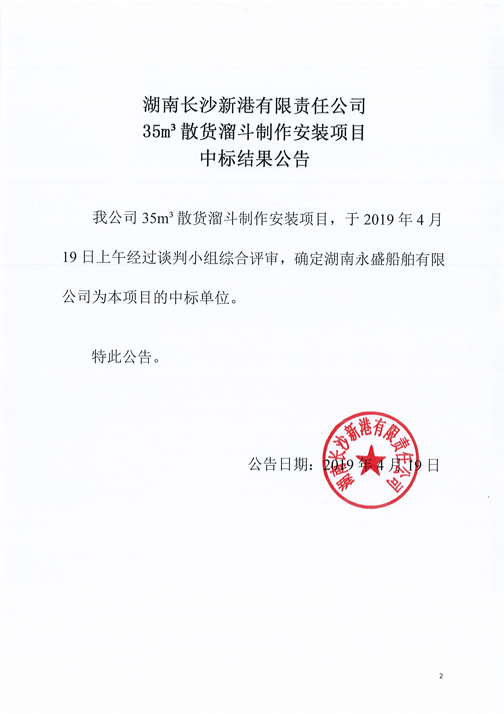 湖南長(zhǎng)沙新港有限責(zé)任公司35m³散貨溜斗制作安裝項(xiàng)目中標(biāo)結(jié)果公告