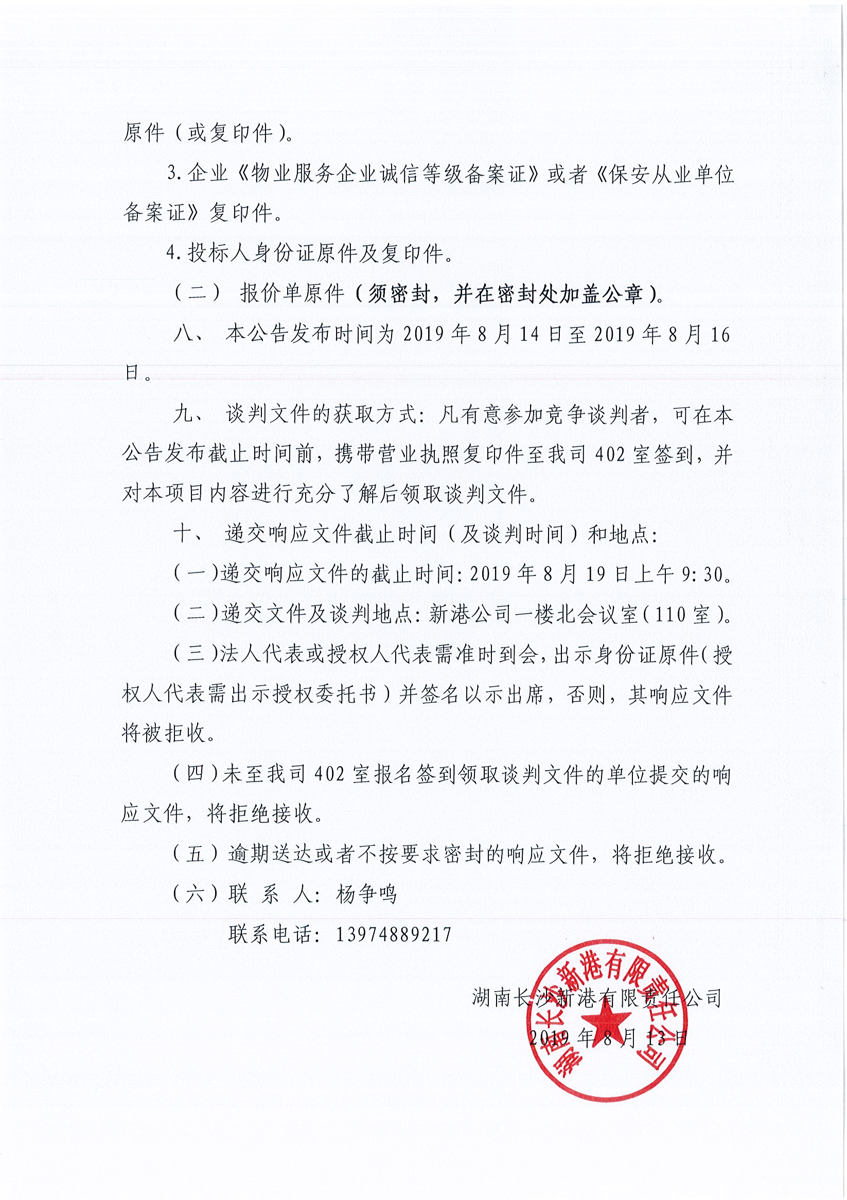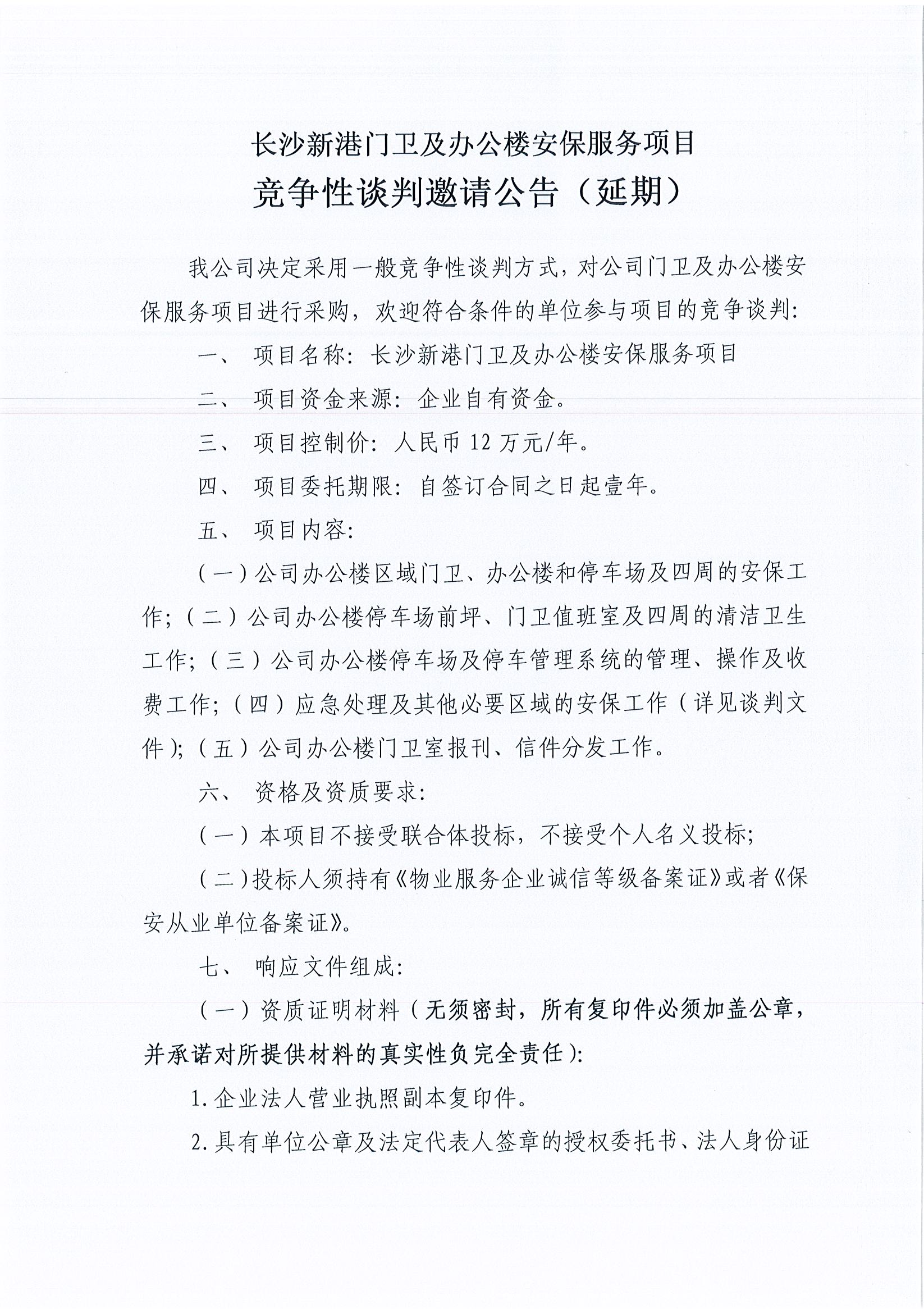長沙新港門衛(wèi)及辦公樓安保服務(wù)項(xiàng)目競爭性談判邀請公告(延期)