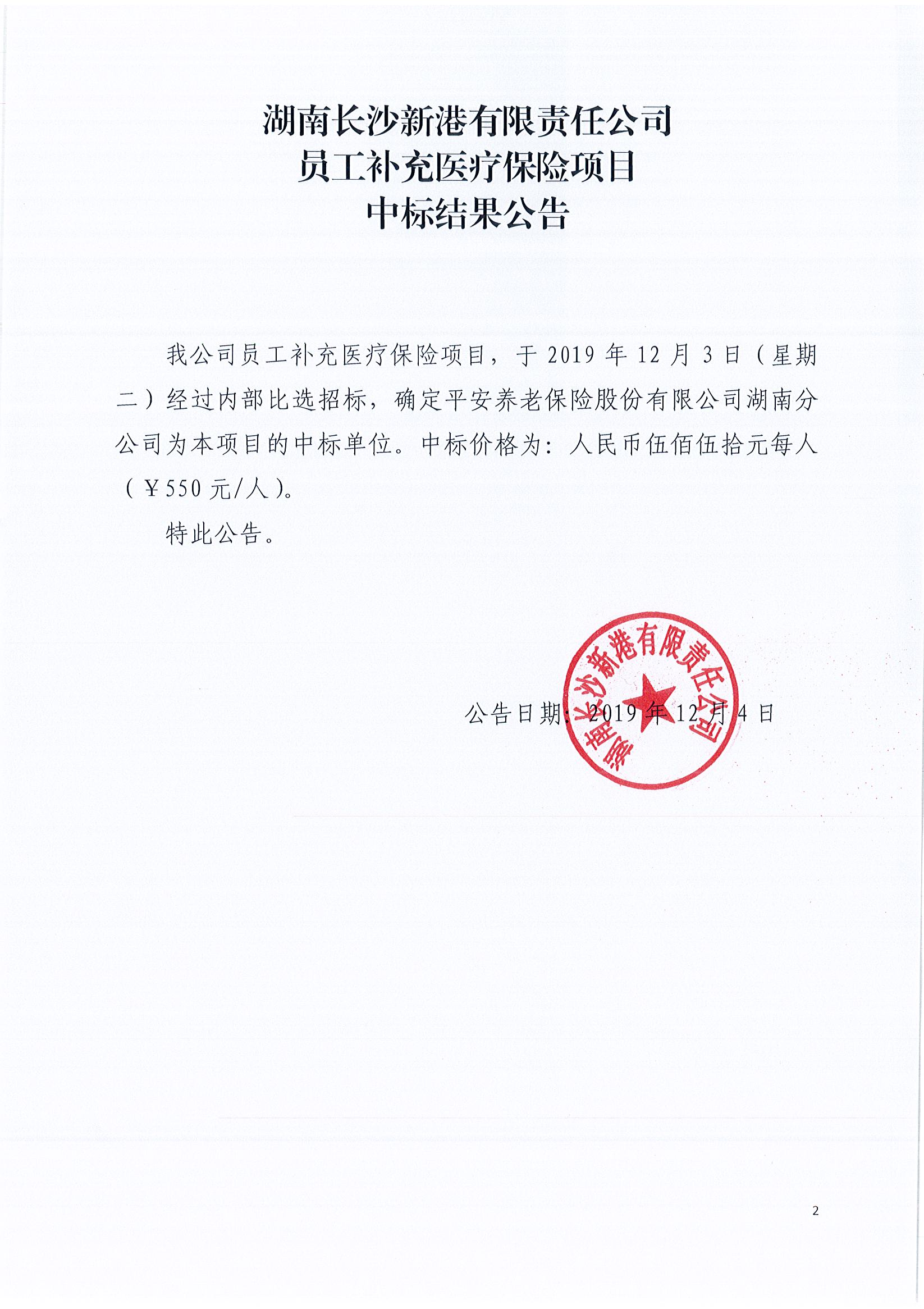 湖南長沙新港有限責(zé)任公司員工補充醫(yī)療保險項目中標結(jié)果公告