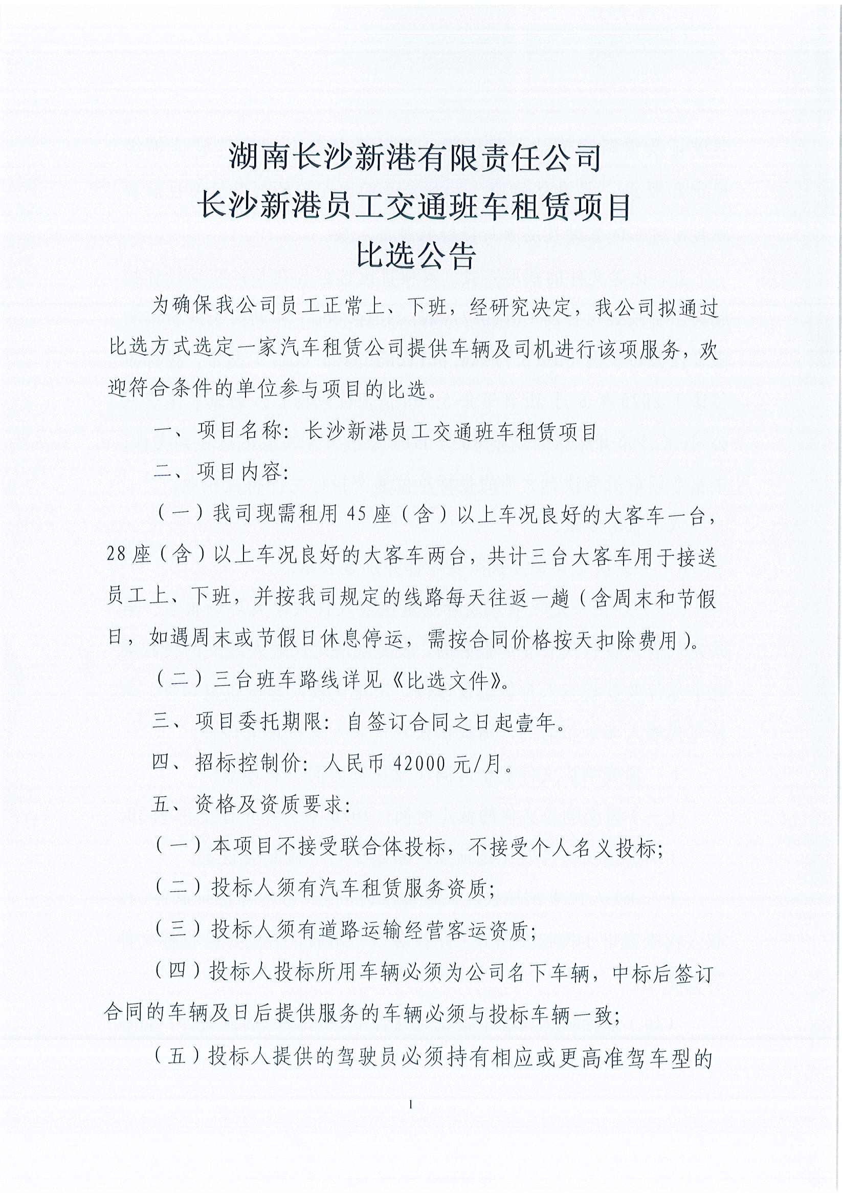 《長(zhǎng)沙新港員工交通班車租賃項(xiàng)目》比選公告