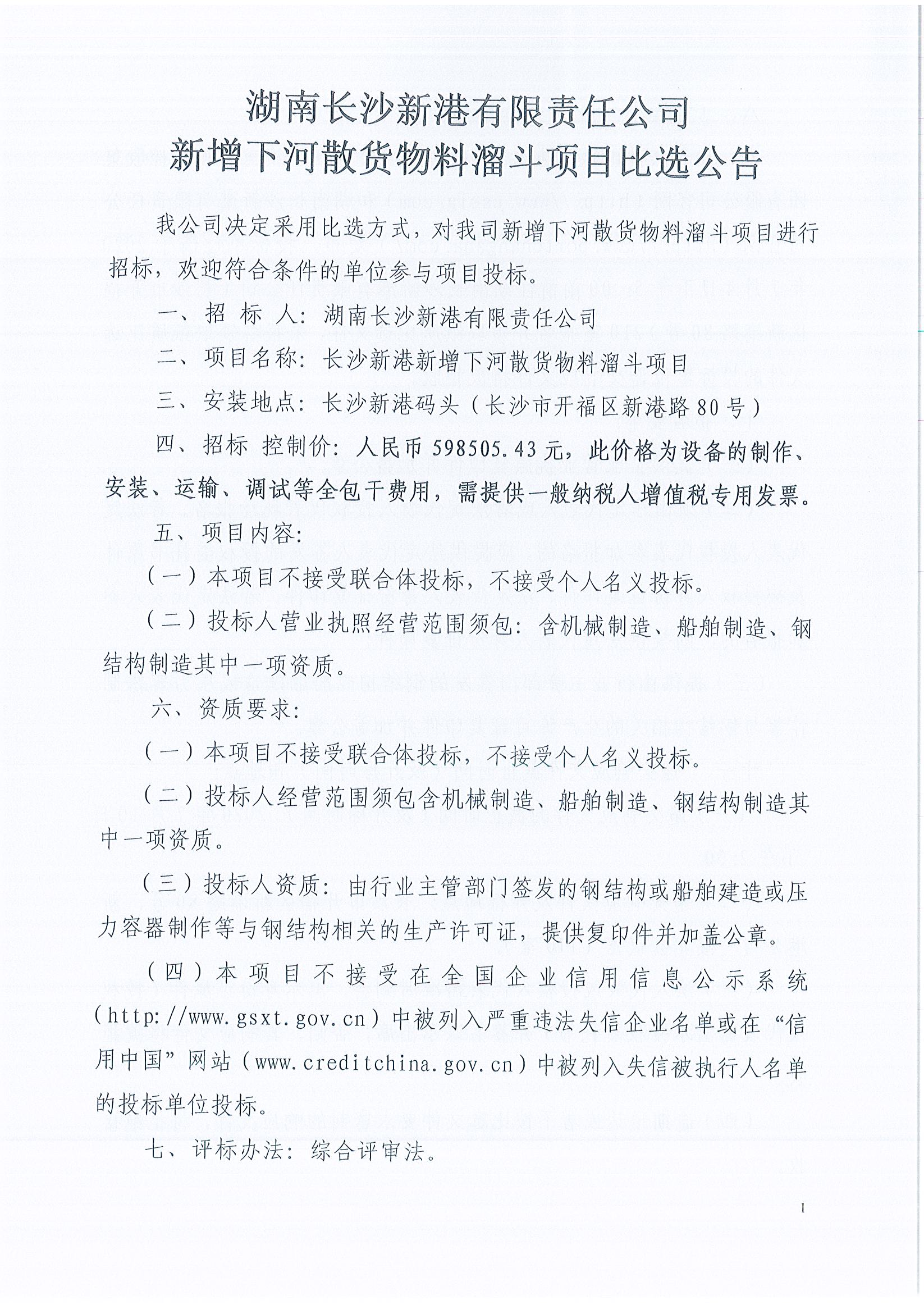 湖南長沙新港有限責(zé)任公司新增下河散貨物料溜斗項目比選公告