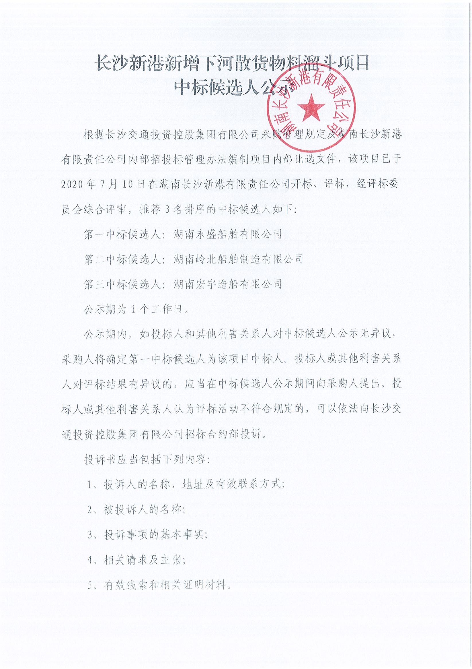 長(zhǎng)沙新港新增下河散貨物料溜斗項(xiàng)目中標(biāo)候選人公示