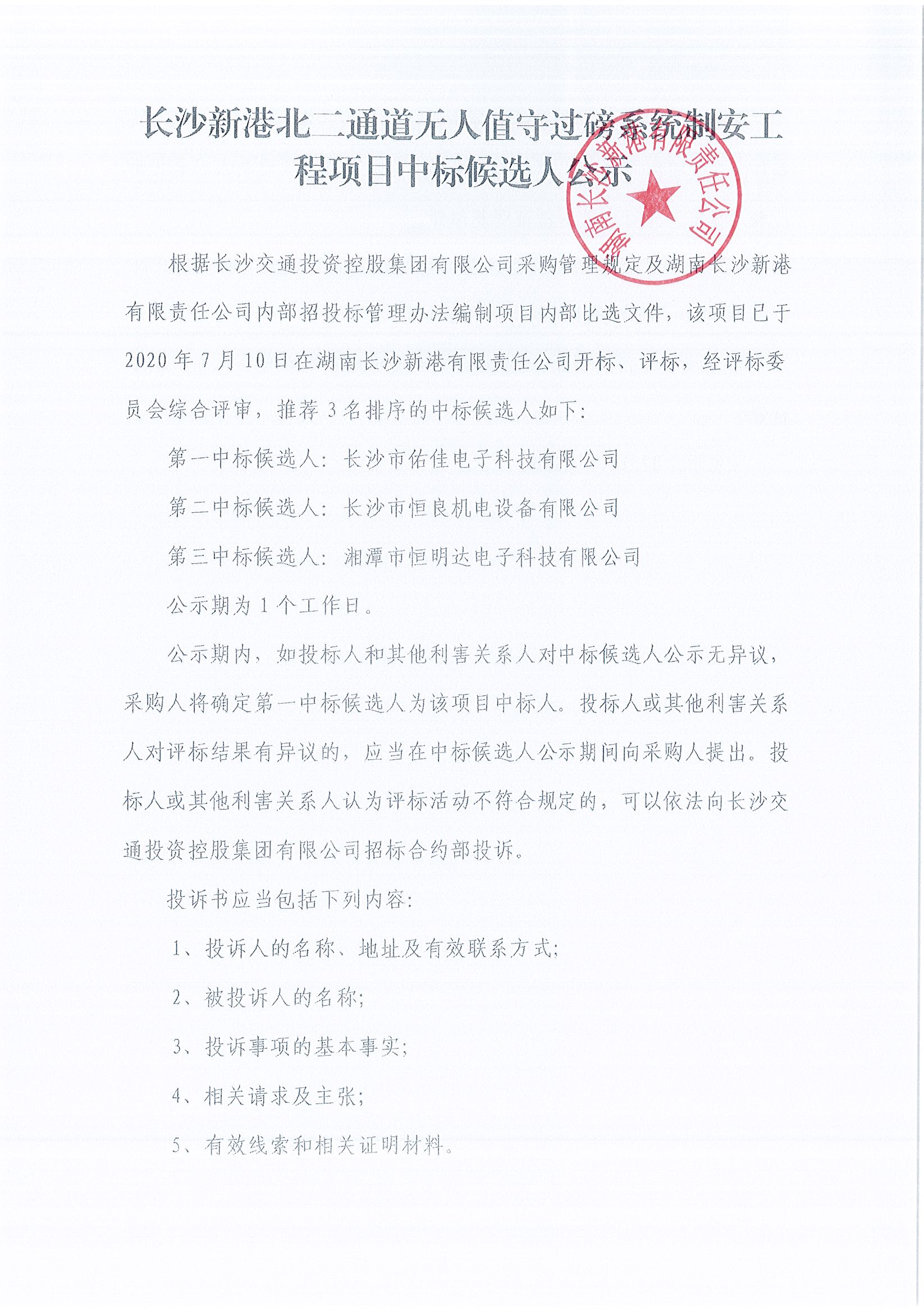長沙新港北二通道無人值守過磅系統(tǒng)制安工程項目中標候選人公示