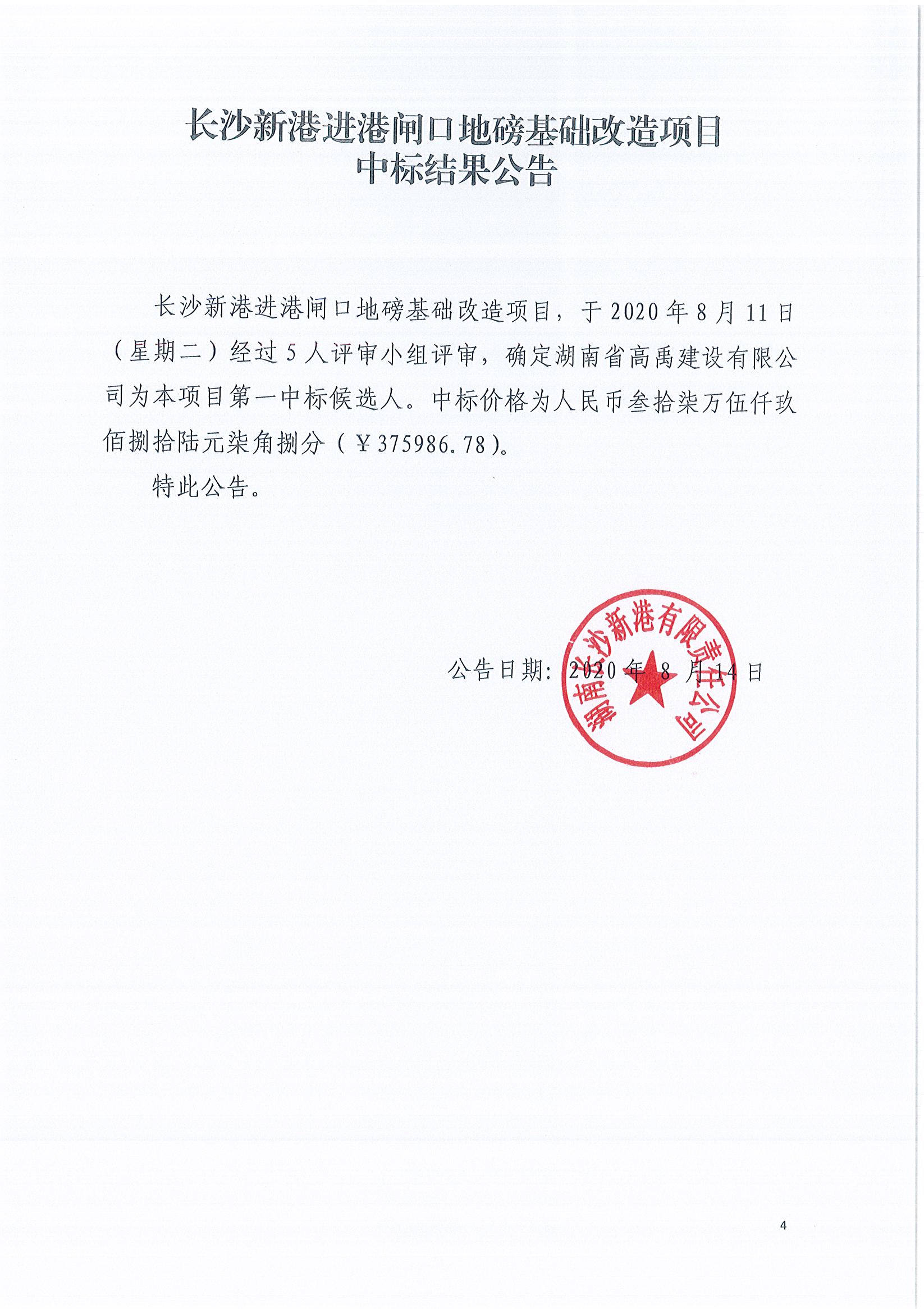 長沙新港進(jìn)港閘口地磅基礎(chǔ)改造項(xiàng)目中標(biāo)結(jié)果公告